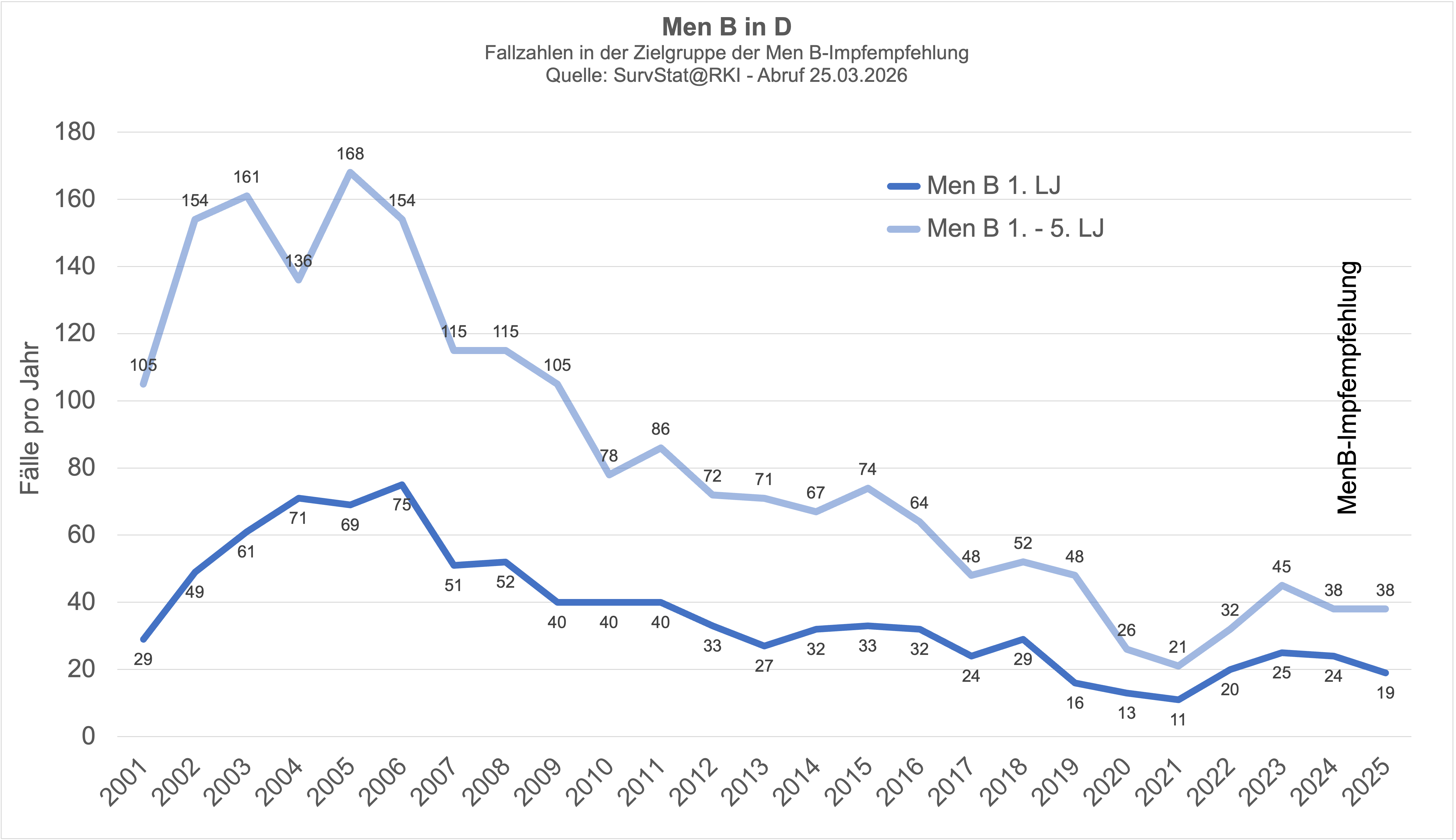 Angesichts der extrem geringen Fallzahlen der letzten Jahre hat die STIKO im Herbst 2025 die allgemeine Impfempfehlung gegen MenC für Säuglinge zurückgenommen - auch dies ein Indiz dafür, dass sie selbst dem eigenen Narrativ nicht glaubt, es sei vor allem die Impfung gewesen, die diesen Rückgang bewirkt hat... .