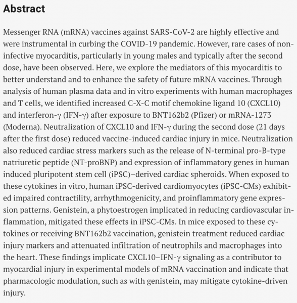 Eine Studie der Stanford Universität untersuchte in Zell- und Tiermodellen den möglichen Mechanismus der Myokarditis nach mRNA-Impfstoffen. Die entscheidende Rolle schreiben die Autoren u.a. einer übermäßigen Aktivierung von Interferon γ zu und fürchten ausdrücklich, "dass eine Myokardschädigung durch erhöhte IFN-γ-Signalübertragung ein Klasseneffekt von mRNA-Impfstoffen sein kann, da die IFN-γ-Signalübertragung ein grundlegender Abwehrmechanismus gegen exogene DNA- und RNA-Moleküle, einschließlich viraler Nukleinsäuren, ist." Eine übermäßige Aktivierung der IFN-γ-Signalübertragung könne womöglich zu unerwünschten Ergebnissen führen, wenn in Zukunft neue mRNA-Impfstoffe für Infektionskrankheiten und bösartige Tumore entwickelt werden.