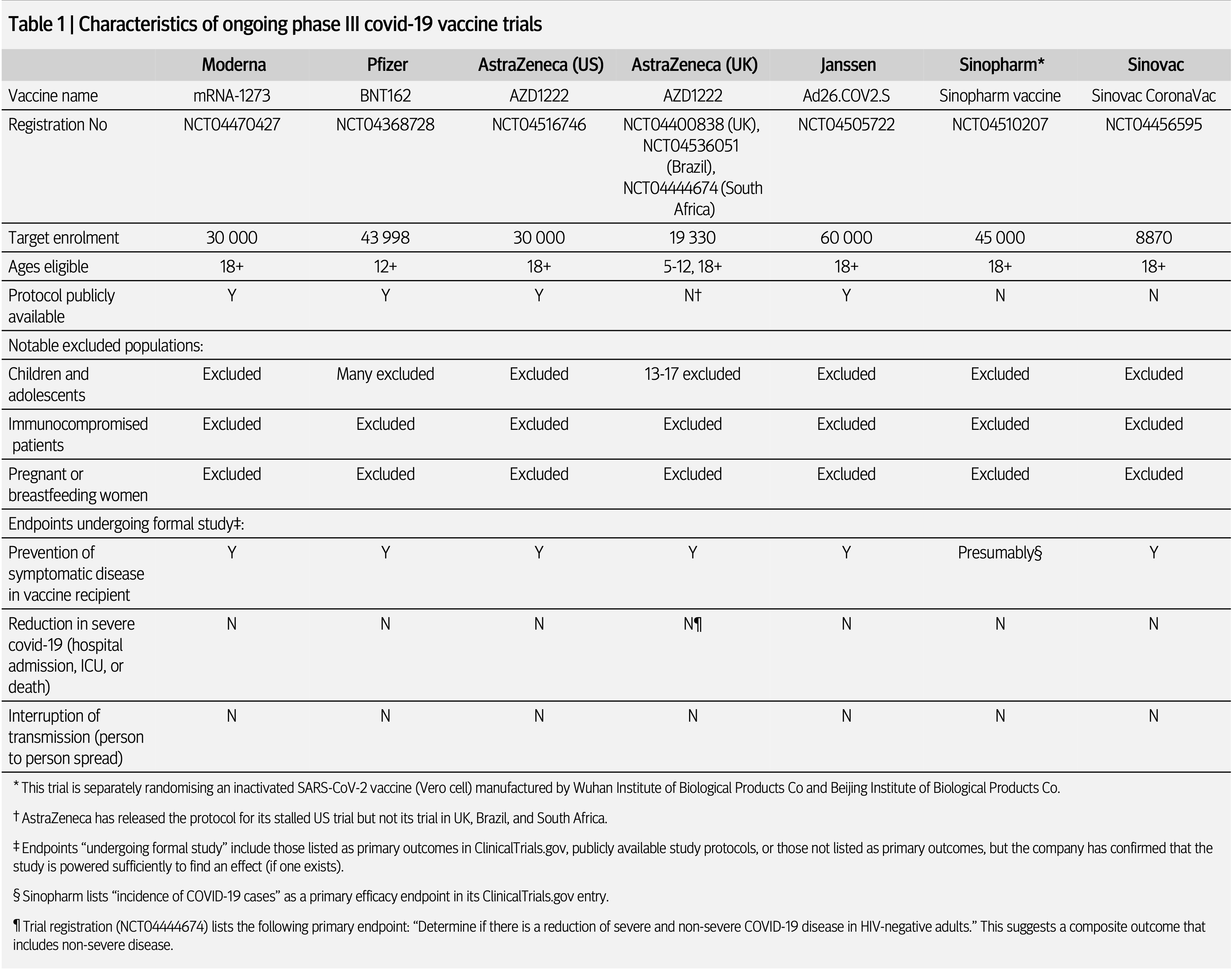 Der Autor liefert im Artikel eine tabellarische Übersicht der aktuell (Ende Oktober 2020) in einer Phase III-Studie befindlichen Kandidaten