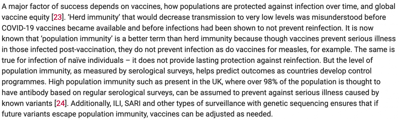 ... mit klaren Worten auch zum Gedanken der Herden/Bevölkerungsimmunität - allerdings dann doch nicht mutig genug auszusprechen, dass das Fehlen eines zuverlässigen Schutzes der Impfung gegen Infektion eben auch das Fehlen eines Schutzes gegen Übertragung bedeutet... der berühmte Elefant im Raum. Na ja, einer der Autoren ist auch an der berüchtigten London School of Hygiene and Tropical Medicine... die ist bezüglich ihrer Pandemie-Modellierung in einer Liga mit Dirk Brockmann et al.... "Modellierer des Schreckens"