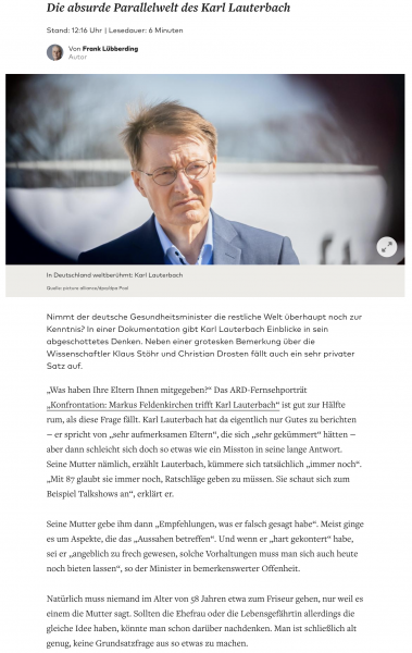 Nimmt der deutsche Gesundheitsminister die restliche Welt überhaupt noch zur Kenntnis? In einer Dokumentation gibt Karl Lauterbach Einblicke in sein abgeschottetes Denken. Neben einer grotesken Bemerkung über die Wissenschaftler Klaus Stöhr und Christian Drosten fällt auch ein sehr privater Satz auf.