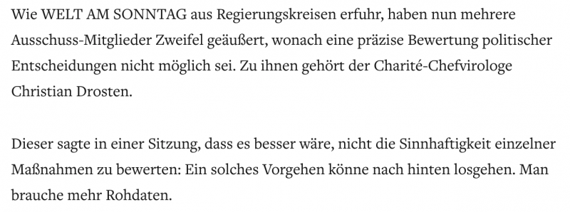 Drosten: die Maßnahmen, die ich vorschlug wissenschaftlich zu bewerten, könnte nach hinten losgehen...