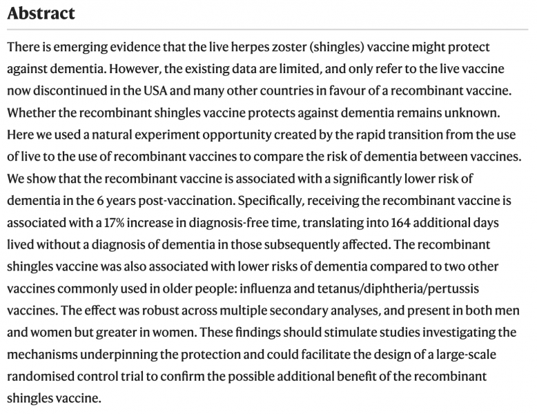 Es zeigte sich, dass Shingrix™ 17% mehr demenzfreie Zeit der Geimpften erreichte als Zostavax™ und etwa 25% mehr als nach Verabreichung anderer "seniorentypischer" Impfstoffe (Influenza, Tetanus, ...). Am Ende der 6-jährigen Beobachtungszeit nivellierte sich dieser Effekt jedoch, so dass die Autoren selbst vermuten, es könne gut sein, dass Shingrix™ eher den Beginn einer Demenz (etwas) hinauszögere, als die Erkrankung zu verhindern (The observation that the time-varying HR became greater than 1 towards the end of the follow-up might imply that the vaccine delays rather than prevents dementia onset.).