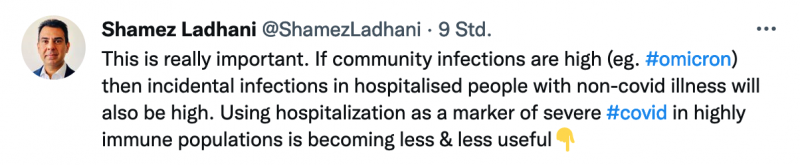 This is really important. If community infections are high (eg. #omicron) then incidental infections in hospitalised people with non-covid illness will also be high. Using hospitalization as a marker of severe #covid in highly immune populations is becoming less & less useful👇 https://t.co/VZNqYfnMuj