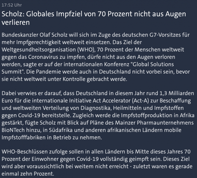 der Vergleich zwischen der Tagesschau, die politische Lippenkbekenntnisse zur globalen Impfstoff-Gerechtigkeit paraphrasiert und reuters, die die fehlende Information ergänzt, dass Scholz sich noch einmal eindeutig gegen die Freigabe von Impfstoff-Patenten (wie sie von vielen NGOs gefordert wird) positioniert hat.