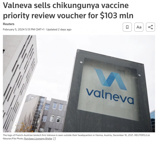Der Impfstoffhersteller Valneva zeigt jetzt, dass hier noch reichlich Luft nach unten ist: sie verkaufte den ihr für die Entwicklung des Impfstoffs gegen Chikungunya erhaltenen PRV jetzt für 103 Millionen US-Dollar kurzerhand weiter... . Spätestens damit ist nun klar und öffentlich, dass die bevorzugte Behandlung von Pharmafirmen durch Gesundheitsbehörden schlicht (ver-)käuflich ist....