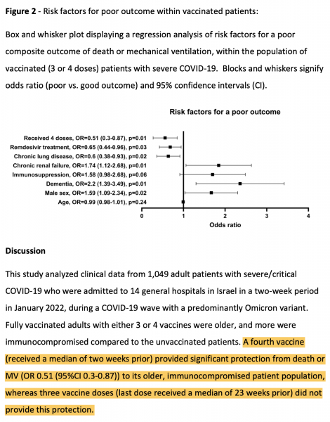 - Das Risiko für Intensivstation mit künstlicher Beatmung oder Tod (primärer Studienendpunkt) war im Falle einer Durchbruchsinfektion mit Omikron im Mittel 160 Tage nach dem ersten booster vergleichbar mit dem Risiko Ungeimpfter [!] (wobei in dieser Studie einmal Geimpfte in dieser Gruppe mitgezählt wurden)