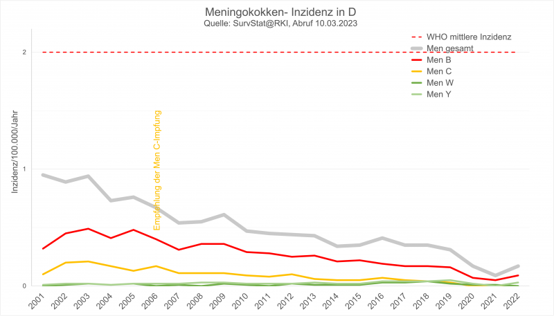 In Deutschland bleiben (wie auch in den USA) Meningokokken-Erkrankungen aller Serotypen sehr seltene Ereignisse, ihre Häufigkeit (Inzidenz) liegt weit unterhalb der Grenze, die die WHO für entsprechende Impfempfehlungen vorsieht.
