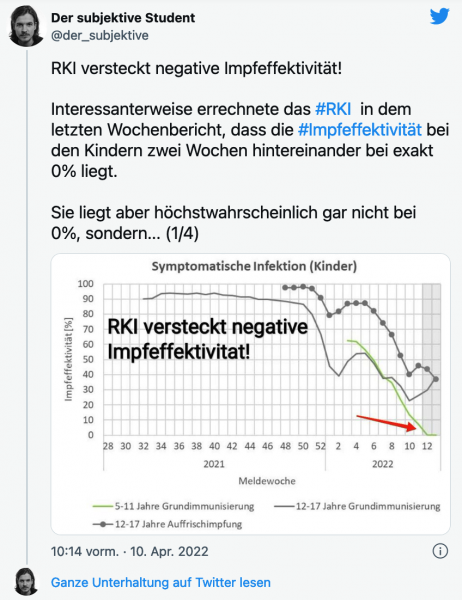 Die letzten Wochenberichte waren einem aufmerksamen und kritischen Twitter-Nutzer aufgefallen, da sie Hinweise auf eine mögliche negative Impfeffektivität der mRNA-Impfung bei Kindern enthielten:
