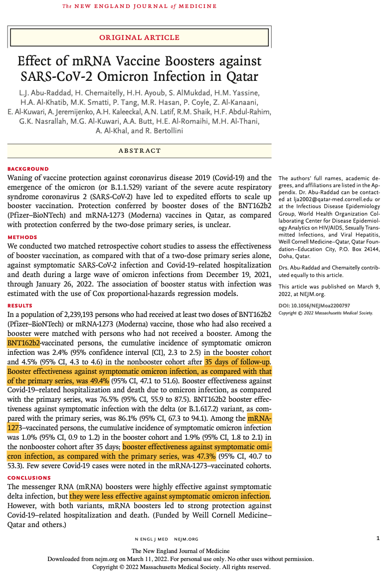 Effect of mRNA Vaccine Boosters against SARS-CoV-2 Omicron Infection in Qatar | NEJM