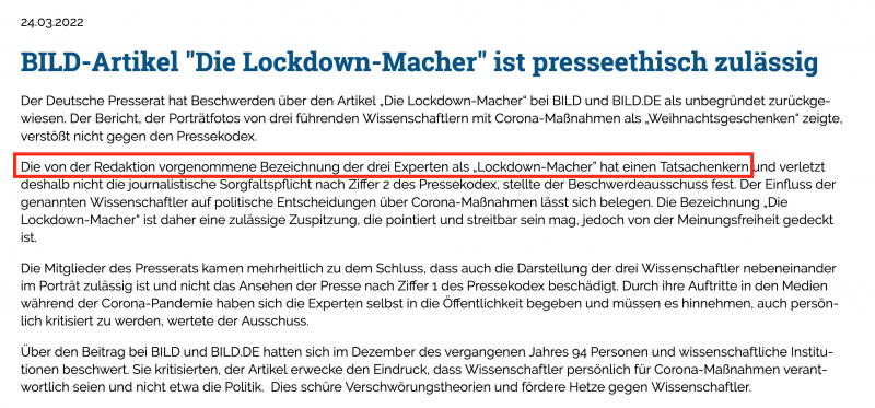 Presserat: BILD-Schlagzeile "Die Lockdown-Macher" hat "Tatsachenkern"