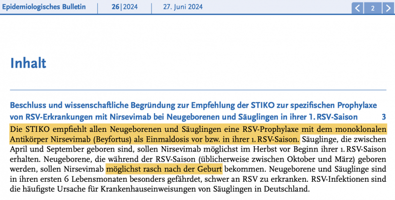 Wie kaum anders zu erwarten, hat die STIKO die passive RSV-Impfung Beyfortus™ für alle Säuglinge in Deutschland vor ihrer jeweils ersten RSV-Saison empfohlen und legt Kinderärzten und Geburtskliniken nahe, diese passive Immunisierung am besten noch während des Krankenhausaufenthaltes nach der Geburt oder bei der Vorsorgeuntersuchung U2 (3. - 10. Lebenstag) durchzuführen.