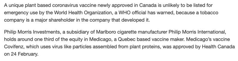 WHO: kanadischer COVID-Impfstoff wird nicht empfohlen, weil Philip Morris an der Herstellerfirma beteiligt ist...