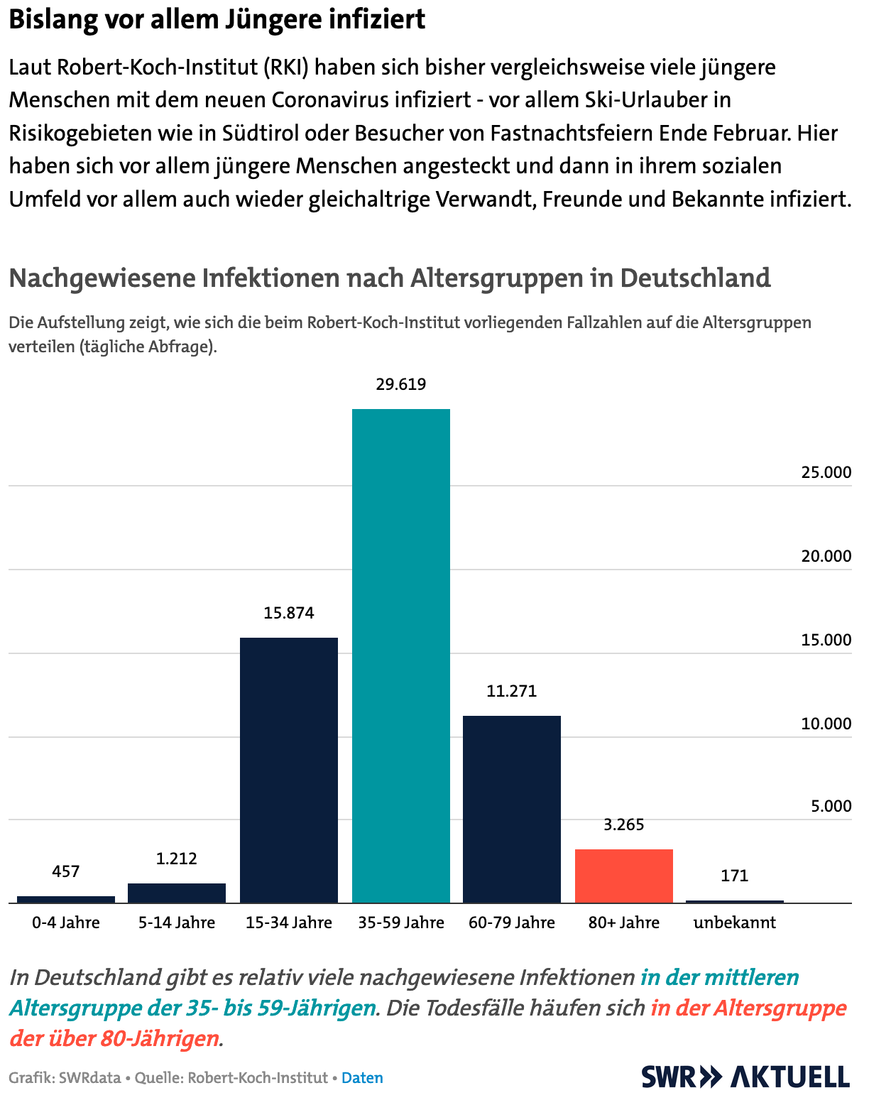 Die Tatsache, dass wir in Deutschland bisher Infektionen vor allem bei den 15 - 59-Jährigen (den "Jüngeren") nachgewiesen haben, ist eben überhaupt nicht das gleiche, wie die Aussage, dass bislang vor allem Jüngere infiziert sind!