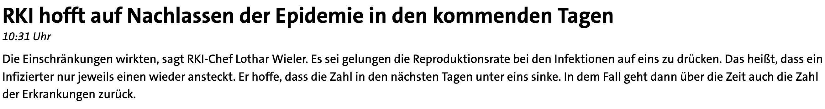 Auf der heutigen Pressekonferenz des RKI erzählte Wieler lt. dem liveblog auf tagesschau.de darüber hinaus stolz, dass es gelungen sei, die Reproduktionsrate auf "eins" zu senken.